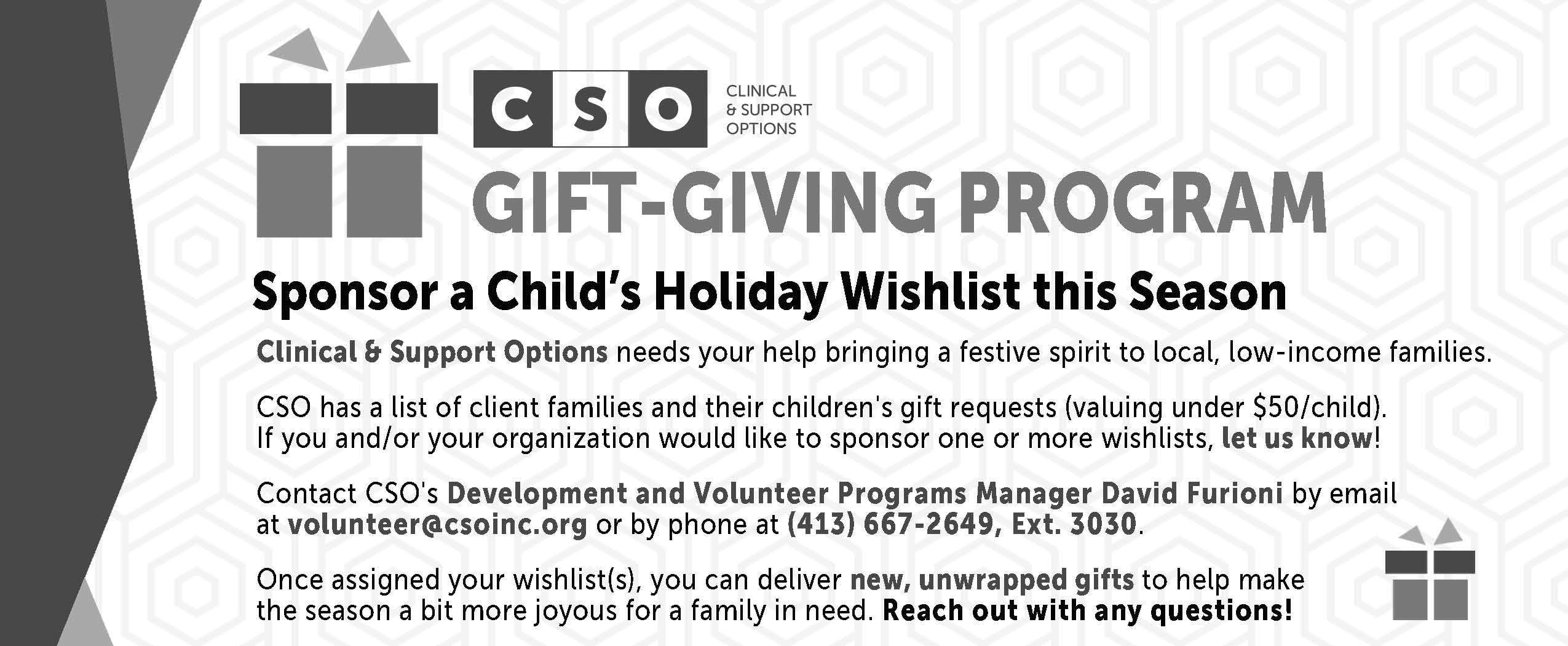 · Gift Sponsorship for Low-Income Youth — CSO has collected more than 400 child holiday "wishlists" from low-income client-families. Choose families to sponsor and help fulfill their seasonal toy-buying.