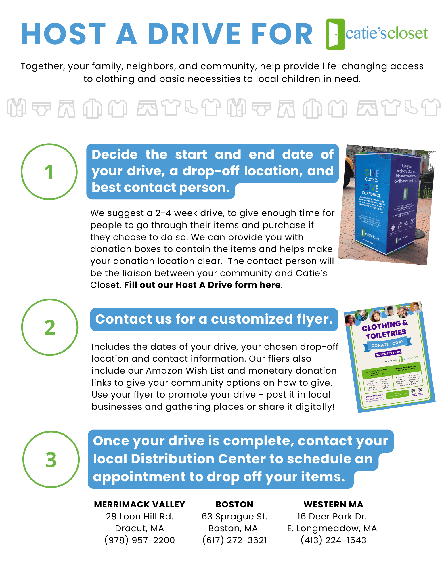 The donations you collect will directly support local children in crisis, providing immediate relief and confidence, and allowing them to thrive in school and in life. We will provide you with a customized flier that you can post, print, and share to promote your drive. Pickup options are available at the end of your drive.