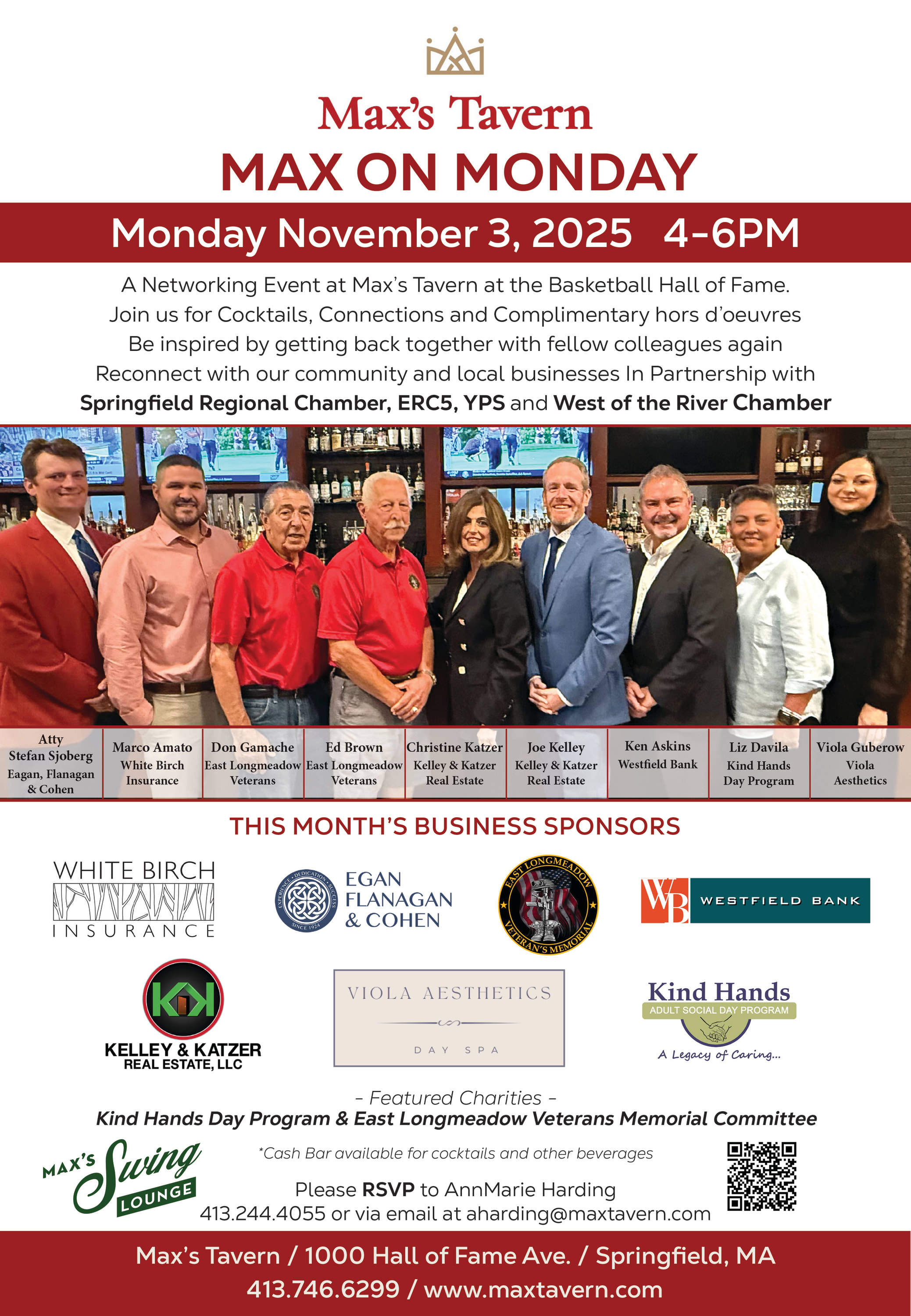 Max's Tavern - MAX ON MONDAY Back to Member News Max's Tavern - MAX ON MONDAY By AnnMarie Harding 10/14/2025 Monday November 3, 2025 4 - 6PM Images × Share × Email Facebook LinkedIn X Pinterest Powered By GrowthZone