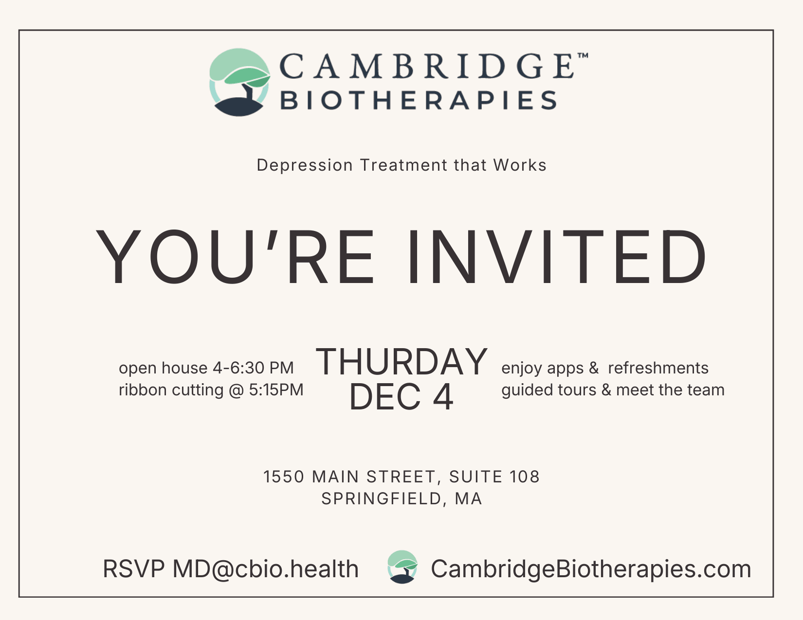 You're Invited - CAMBRIDGE BIOTHERAPIES Ribbon Cutting Back to Member News You're Invited - CAMBRIDGE BIOTHERAPIES Ribbon Cutting By Brendan O'Connor 11/24/2025 Images × Share × Email Facebook LinkedIn X Pinterest Powered By GrowthZone